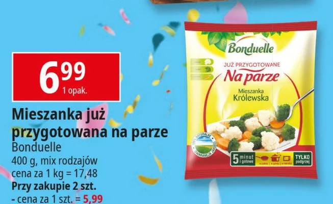 Cena produktu r贸偶ni si臋 w zale偶no艣ci od wybranego sklepu. Niestety nie posiadamy danych o aktualnych promocjach, jednak w艣r贸d archiwalnych ofert Mieszanka kr贸lewska na parze Bonduelle kosztuje od 3,99 z艂 do 5,99 z艂.