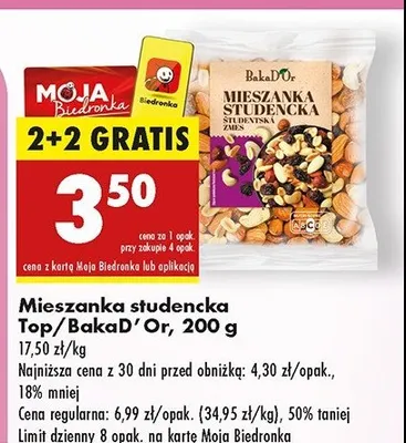 Zastanawiasz si臋, gdzie kupi膰 i ile kosztuje produkt Mieszanka studencka Bakad'or? Regularnie sprawdzamy, czy jest promocja na ten produkt w Biedronka, Lidl, Kaufland, Auchan, Netto, Makro i innych sklepach. Aktualnie posiadamy 2 oferty promocyjne na ten produkt. Ceny zaczynaj膮 si臋 od 4,99z艂!