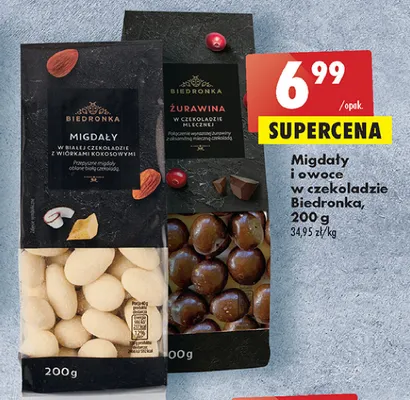 Gdzie mo偶na tanio kupi膰 produkt Migda艂y w czekoladzie bia艂ej z wi贸rkami kokosowymi Biedronka?