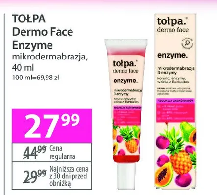 Cena produktu r贸偶ni si臋 w zale偶no艣ci od wybranego sklepu. Niestety nie posiadamy danych o aktualnych promocjach, jednak w艣r贸d archiwalnych ofert Mikrodermabrazja To艂pa dermo face enzyme kosztuje od 27,99 z艂.