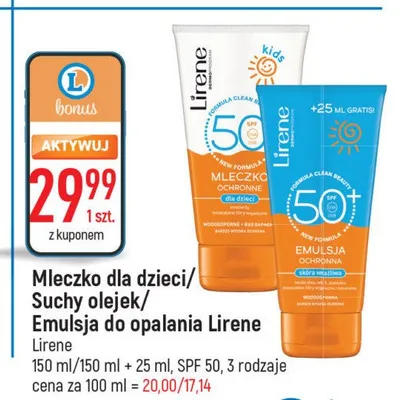 Przegl膮daj podobne oferty promocyjne do Mleczko ochronne dla dzieci wodoodporne spf 30 Lirene dermoprogram kids!