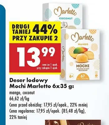 Cena produktu r贸偶ni si臋 w zale偶no艣ci od wybranego sklepu. Niestety nie posiadamy danych o aktualnych promocjach, jednak w艣r贸d archiwalnych ofert Mochi coconut Marletto kosztuje od 13,46 z艂 do 14,49 z艂.
