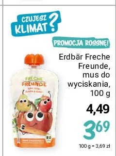 Cena produktu r贸偶ni si臋 w zale偶no艣ci od wybranego sklepu. Niestety nie posiadamy danych o aktualnych promocjach, jednak w艣r贸d archiwalnych ofert Mus jab艂ko gruszka marchewka i dynia kosztuje od 3,69 z艂 do 4,89 z艂.