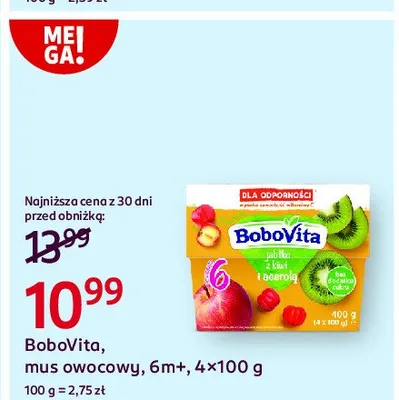 Cena produktu r贸偶ni si臋 w zale偶no艣ci od wybranego sklepu. Niestety nie posiadamy danych o aktualnych promocjach, jednak w艣r贸d archiwalnych ofert Mus jab艂ko kiwi acerola Bobovita kosztuje od 9,99 z艂 do 10,99 z艂.