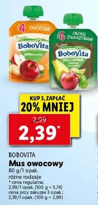 Cena produktu r贸偶ni si臋 w zale偶no艣ci od wybranego sklepu. Niestety nie posiadamy danych o aktualnych promocjach, jednak w艣r贸d archiwalnych ofert Mus jab艂ko z awokado i zielonymi warzywami Bobovita kosztuje od 2,15 z艂 do 2,59 z艂.