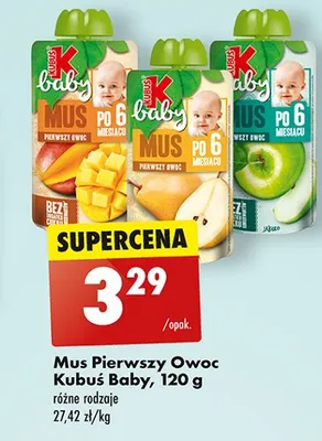 Cena produktu r贸偶ni si臋 w zale偶no艣ci od wybranego sklepu. Niestety nie posiadamy danych o aktualnych promocjach, jednak w艣r贸d archiwalnych ofert Mus pierwszy owoc gruszka Kubu艣 baby kosztuje od 3,29 z艂.