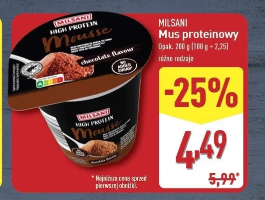 Cena produktu r贸偶ni si臋 w zale偶no艣ci od wybranego sklepu. Produkt Mus proteinowy czekoladowy Milsani mo偶esz kupi膰 w promocji ju偶 od 3,99 z艂. Najta艅sza oferta, jak膮 mamy w naszej bazie jest z sieci Stokrotka. Mus proteinowy czekoladowy Milsani kosztuje aktualnie 3,99 z艂. Zobacz ofert臋