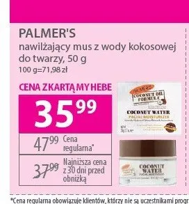 Cena produktu r贸偶ni si臋 w zale偶no艣ci od wybranego sklepu. Niestety nie posiadamy danych o aktualnych promocjach, jednak w艣r贸d archiwalnych ofert Mus z wody kokosowej do twarzy Palmer's kosztuje od 28,99 z艂 do 35,99 z艂.