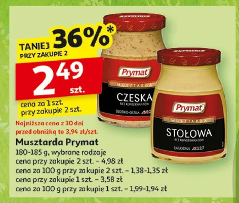 Cena produktu r贸偶ni si臋 w zale偶no艣ci od wybranego sklepu. Niestety nie posiadamy danych o aktualnych promocjach, jednak w艣r贸d archiwalnych ofert Musztarda czeska Prymat kosztuje od 0,01 z艂 do 4,49 z艂.