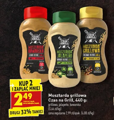 Cena produktu r贸偶ni si臋 w zale偶no艣ci od wybranego sklepu. Niestety nie posiadamy danych o aktualnych promocjach, jednak w艣r贸d archiwalnych ofert Musztarda jalapeno Czas na grill kosztuje od 2,39 z艂 do 2,99 z艂.