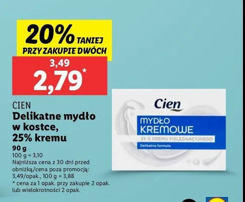 Cena produktu r贸偶ni si臋 w zale偶no艣ci od wybranego sklepu. Niestety nie posiadamy danych o aktualnych promocjach, jednak w艣r贸d archiwalnych ofert Myd艂o kremowe Cien kosztuje od 1,04 z艂 do 2,99 z艂.