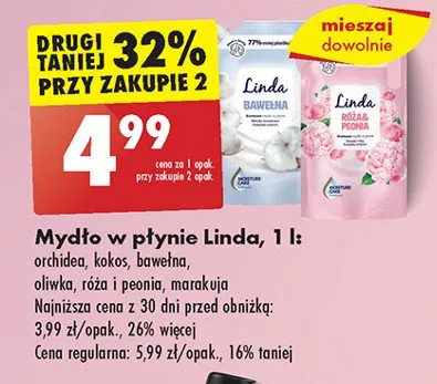 Cena produktu r贸偶ni si臋 w zale偶no艣ci od wybranego sklepu. Niestety nie posiadamy danych o aktualnych promocjach, jednak w艣r贸d archiwalnych ofert Myd艂o w p艂ynie guarana i marakuja Linda kosztuje od 3,99 z艂 do 5,99 z艂.