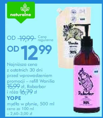 Cena produktu różni się w zależności od wybranego sklepu. Niestety nie posiadamy danych o aktualnych promocjach, jednak wśród archiwalnych ofert Mydło w płynie rabarbar i róża Yope kosztuje od 12,99 zł do 15,99 zł.