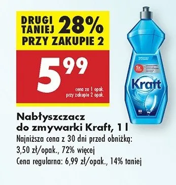 Cena produktu r贸偶ni si臋 w zale偶no艣ci od wybranego sklepu. Niestety nie posiadamy danych o aktualnych promocjach, jednak w艣r贸d archiwalnych ofert Nab艂yszczacz do zmywarek Kraft kosztuje od 4,99 z艂 do 5,99 z艂.
