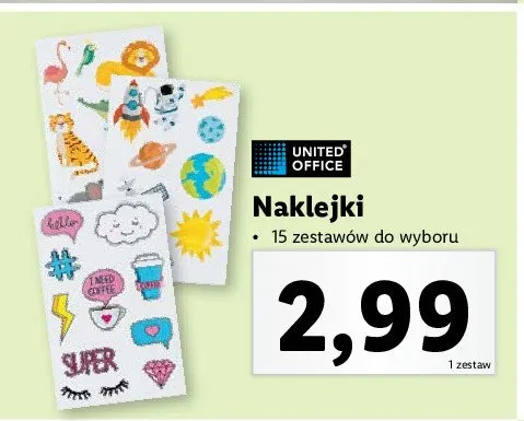 Cena produktu r贸偶ni si臋 w zale偶no艣ci od wybranego sklepu. Niestety nie posiadamy danych o aktualnych promocjach, jednak w艣r贸d archiwalnych ofert Naklejki UNITED OFFICE kosztuje od 2,99 z艂.