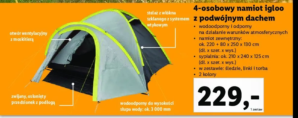 Cena produktu r贸偶ni si臋 w zale偶no艣ci od wybranego sklepu. Produkt Namiot 4-osobowy igloo mo偶esz kupi膰 w promocji ju偶 od 168 z艂. Najta艅sza oferta, jak膮 mamy w naszej bazie jest z sieci Castorama. Namiot 4-osobowy igloo kosztuje aktualnie 168 z艂. Zobacz ofert臋