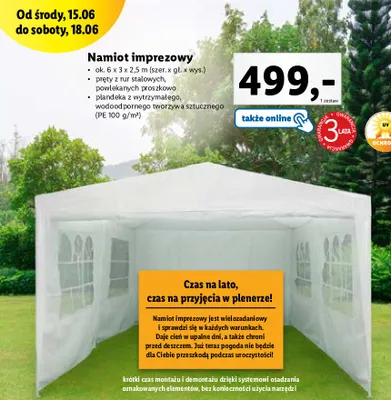 Zastanawiasz si臋, gdzie kupi膰 i ile kosztuje produkt Namiot 6 x 3 x 2.5 m? Regularnie sprawdzamy, czy jest promocja na ten produkt w Biedronka, Lidl, Kaufland, Auchan, Netto, Makro i innych sklepach. Aktualnie nie posiadamy ofert promocyjnych na ten produkt.