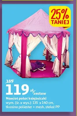 Cena produktu różni się w zależności od wybranego sklepu. Niestety nie posiadamy danych o aktualnych promocjach, jednak wśród archiwalnych ofert Namiot do zabawy pałac księżniczki kosztuje od 99,99 zł do 119 zł.