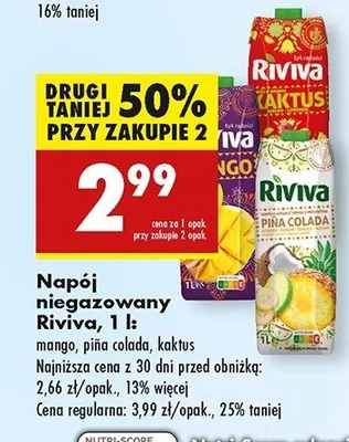 Cena produktu r贸偶ni si臋 w zale偶no艣ci od wybranego sklepu. Niestety nie posiadamy danych o aktualnych promocjach, jednak w艣r贸d archiwalnych ofert Nap贸j kaktus Riviva kosztuje od 2,89 z艂 do 2,99 z艂.