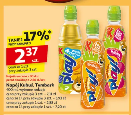 Cena produktu r贸偶ni si臋 w zale偶no艣ci od wybranego sklepu. Niestety nie posiadamy danych o aktualnych promocjach, jednak w艣r贸d archiwalnych ofert Nap贸j marchew-malina-limonka Kubu艣 play! kosztuje od 2,19 z艂 do 2,49 z艂.