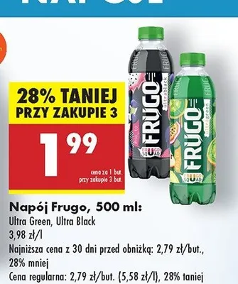 Cena produktu r贸偶ni si臋 w zale偶no艣ci od wybranego sklepu. Niestety nie posiadamy danych o aktualnych promocjach, jednak w艣r贸d archiwalnych ofert Nap贸j zielony Frugo kosztuje od 1,99 z艂 do 2,89 z艂.
