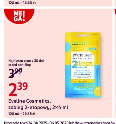 Cena produktu różni się w zależności od wybranego sklepu. Niestety nie posiadamy danych o aktualnych promocjach, jednak wśród archiwalnych ofert Nawilżająco-rozświetlający zabieg 2-etapowy Eveline kosztuje od 2,39 zł do 2,49 zł.