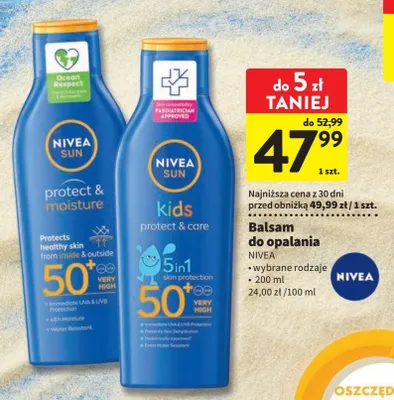 Cena produktu różni się w zależności od wybranego sklepu. Niestety nie posiadamy danych o aktualnych promocjach, jednak wśród archiwalnych ofert Nawilżający balsam ochronny na słońce spf 50+ Nivea sun kids kosztuje od 29,99 zł do 47,99 zł.