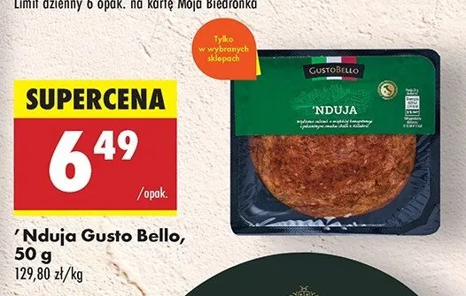 Zastanawiasz si臋, gdzie kupi膰 i ile kosztuje produkt Nduja Gustobello? Regularnie sprawdzamy, czy jest promocja na ten produkt w Biedronka, Lidl, Kaufland, Auchan, Netto, Makro i innych sklepach. Aktualnie nie posiadamy ofert promocyjnych na ten produkt.