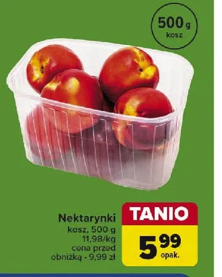 Zastanawiasz si臋, gdzie kupi膰 i ile kosztuje produkt Nektarynki? Regularnie sprawdzamy, czy jest promocja na ten produkt w Biedronka, Lidl, Kaufland, Auchan, Netto, Makro i innych sklepach. Aktualnie posiadamy 2 oferty promocyjne na ten produkt. Ceny zaczynaj膮 si臋 od 16,99z艂!