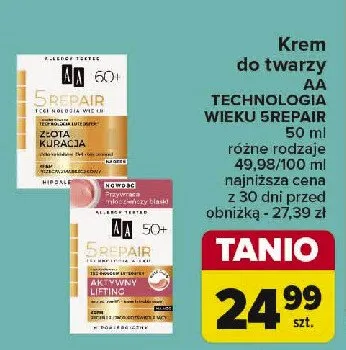 Cena produktu różni się w zależności od wybranego sklepu. Niestety nie posiadamy danych o aktualnych promocjach, jednak wśród archiwalnych ofert Nocny krem odżywczo-regenerujący 50+ aktywny lifting Aa technologia wieku 5repair kosztuje od 16,99 zł do 24,99 zł.
