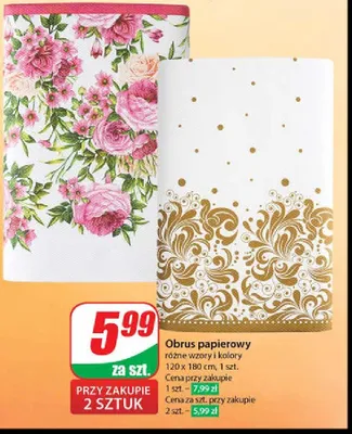 Cena produktu r贸偶ni si臋 w zale偶no艣ci od wybranego sklepu. Niestety nie posiadamy danych o aktualnych promocjach, jednak w艣r贸d archiwalnych ofert Obrus papierowy 120 x 180 cm kosztuje od 4,99 z艂 do 7,99 z艂.
