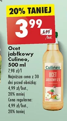 Cena produktu r贸偶ni si臋 w zale偶no艣ci od wybranego sklepu. Niestety nie posiadamy danych o aktualnych promocjach, jednak w艣r贸d archiwalnych ofert Ocet jab艂kowy 6% Culineo kosztuje od 3,99 z艂.