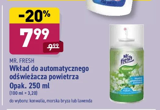 Cena produktu różni się w zależności od wybranego sklepu. Niestety nie posiadamy danych o aktualnych promocjach, jednak wśród archiwalnych ofert Odświeżacz powietrza lawenda - wkład Mr. fresh kosztuje od 6,9 zł do 9,99 zł.