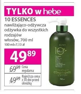 Cena produktu różni się w zależności od wybranego sklepu. Niestety nie posiadamy danych o aktualnych promocjach, jednak wśród archiwalnych ofert Odżywka do włosów nawilżająco-odżywcza Ten essence kosztuje od 49,89 zł do 49,99 zł.