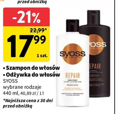 Zastanawiasz si臋, gdzie kupi膰 i ile kosztuje produkt Od偶ywka do w艂os贸w Syoss repair therapy? Regularnie sprawdzamy, czy jest promocja na ten produkt w Biedronka, Lidl, Kaufland, Auchan, Netto, Makro i innych sklepach. Aktualnie posiadamy 4 oferty promocyjne na ten produkt. Ceny zaczynaj膮 si臋 od 10,99z艂!