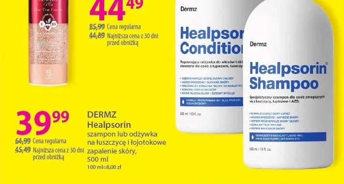 Cena produktu różni się w zależności od wybranego sklepu. Niestety nie posiadamy danych o aktualnych promocjach, jednak wśród archiwalnych ofert Odżywka do włosów z łuszczycą lub łupieżem Dermz healpsorin kosztuje od 39,99 zł do 47,99 zł.
