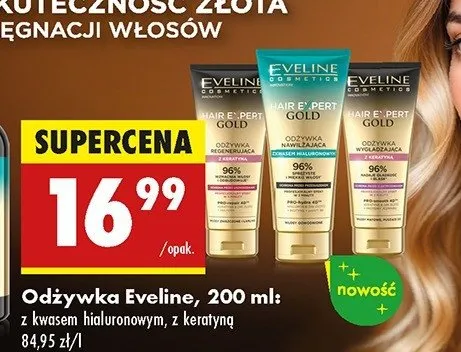 Cena produktu różni się w zależności od wybranego sklepu. Niestety nie posiadamy danych o aktualnych promocjach, jednak wśród archiwalnych ofert Odżywka nawilżająca z kwasem hialuronowym Eveline hair expert gold kosztuje od 16,99 zł.