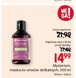 Cena produktu różni się w zależności od wybranego sklepu. Niestety nie posiadamy danych o aktualnych promocjach, jednak wśród archiwalnych ofert Odżywka z czarnuszką do włosów zniszczonych suchych i słabych Mysterium kosztuje od 14,99 zł.