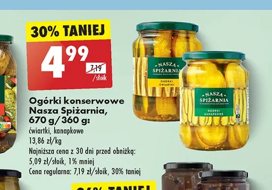 Cena produktu r贸偶ni si臋 w zale偶no艣ci od wybranego sklepu. Niestety nie posiadamy danych o aktualnych promocjach, jednak w艣r贸d archiwalnych ofert Og贸rki 膰wiartki Nasza spi偶arnia kosztuje od 4,99 z艂 do 5,99 z艂.