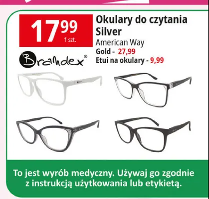 Cena produktu r贸偶ni si臋 w zale偶no艣ci od wybranego sklepu. Niestety nie posiadamy danych o aktualnych promocjach, jednak w艣r贸d archiwalnych ofert Okulary do czytania silver cool Brandex kosztuje od 17,99 z艂.