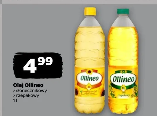 Cena produktu r贸偶ni si臋 w zale偶no艣ci od wybranego sklepu. Produkt Olej s艂onecznikowy Ollineo mo偶esz kupi膰 w promocji ju偶 od 5,99 z艂. Najta艅sza oferta, jak膮 mamy w naszej bazie jest z sieci Biedronka. Olej s艂onecznikowy Ollineo kosztuje aktualnie 5,99 z艂. Zobacz ofert臋