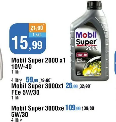 Cena produktu r贸偶ni si臋 w zale偶no艣ci od wybranego sklepu. Niestety nie posiadamy danych o aktualnych promocjach, jednak w艣r贸d archiwalnych ofert Olej syntetyczny x1 f-fe 5w30 Mobil super 3000 kosztuje od 26,99 z艂.
