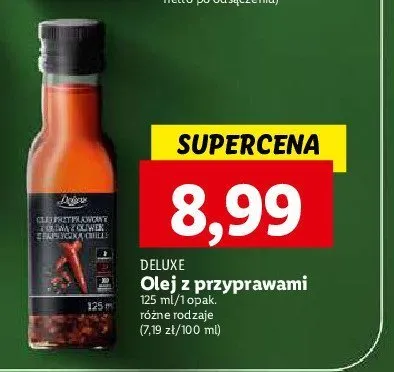 Cena produktu r贸偶ni si臋 w zale偶no艣ci od wybranego sklepu. Niestety nie posiadamy danych o aktualnych promocjach, jednak w艣r贸d archiwalnych ofert Olej z oliw膮 z papryczk膮 chili Deluxe kosztuje od 7,99 z艂 do 8,99 z艂.