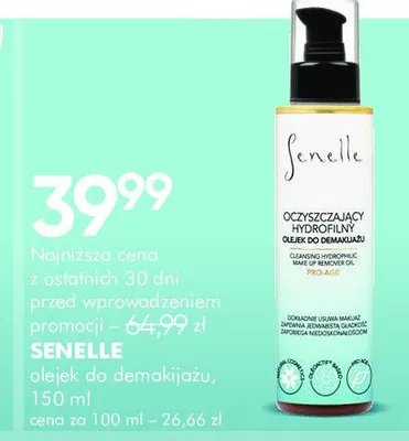 Cena produktu różni się w zależności od wybranego sklepu. Niestety nie posiadamy danych o aktualnych promocjach, jednak wśród archiwalnych ofert Olejek do demakijażu oczyszczający SENELLE kosztuje od 29,99 zł do 39,99 zł.