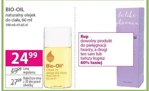 Cena produktu różni się w zależności od wybranego sklepu. Niestety nie posiadamy danych o aktualnych promocjach, jednak wśród archiwalnych ofert Olejek do pielęgnacji skóry naturalny dla skóry wrażiwej Bio-oil kosztuje od 24,99 zł do 34,99 zł.