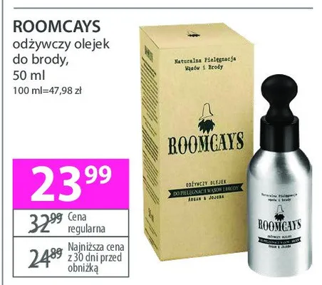 Cena produktu różni się w zależności od wybranego sklepu. Niestety nie posiadamy danych o aktualnych promocjach, jednak wśród archiwalnych ofert Olejek do pielęgnacji wąsów i brody odżywczy Roomcays kosztuje od 19,99 zł do 24,99 zł.