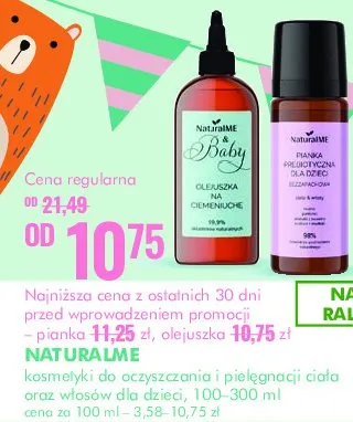 Cena produktu r贸偶ni si臋 w zale偶no艣ci od wybranego sklepu. Niestety nie posiadamy danych o aktualnych promocjach, jednak w艣r贸d archiwalnych ofert Olejuszka na ciemieniuch臋 Naturalme & baby kosztuje od 10,75 z艂 do 14,49 z艂.