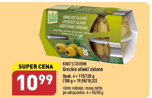 Cena produktu r贸偶ni si臋 w zale偶no艣ci od wybranego sklepu. Niestety nie posiadamy danych o aktualnych promocjach, jednak w艣r贸d archiwalnych ofert Oliwki zielone drylowane King's crown (aldi) kosztuje od 9,99 z艂 do 10,99 z艂.