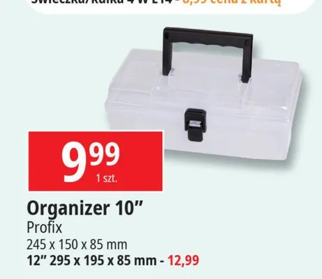Cena produktu r贸偶ni si臋 w zale偶no艣ci od wybranego sklepu. Niestety nie posiadamy danych o aktualnych promocjach, jednak w艣r贸d archiwalnych ofert Organizer z r膮czk膮 10" Profix kosztuje od 5,99 z艂 do 10 z艂.