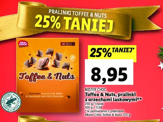 Cena produktu r贸偶ni si臋 w zale偶no艣ci od wybranego sklepu. Niestety nie posiadamy danych o aktualnych promocjach, jednak w艣r贸d archiwalnych ofert Orzech i toffi xxl Mister choc kosztuje od 8,75 z艂 do 8,95 z艂.